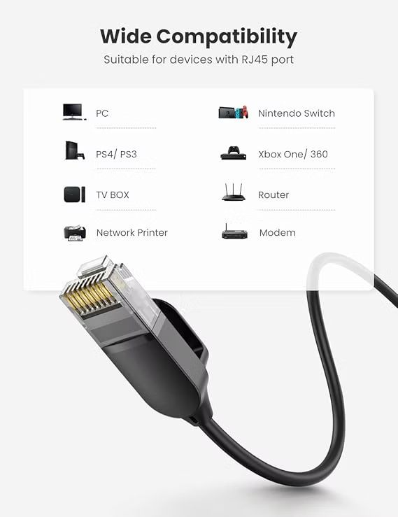 Stable Network Connection: UGREEN Ethernet cable was made from 32AWG bare copper conductors and 24K gold-plated contacts, effectively reduce signal interference and loss. This RJ45 Ethernet cable provides the optimal performance of a fiber connection.