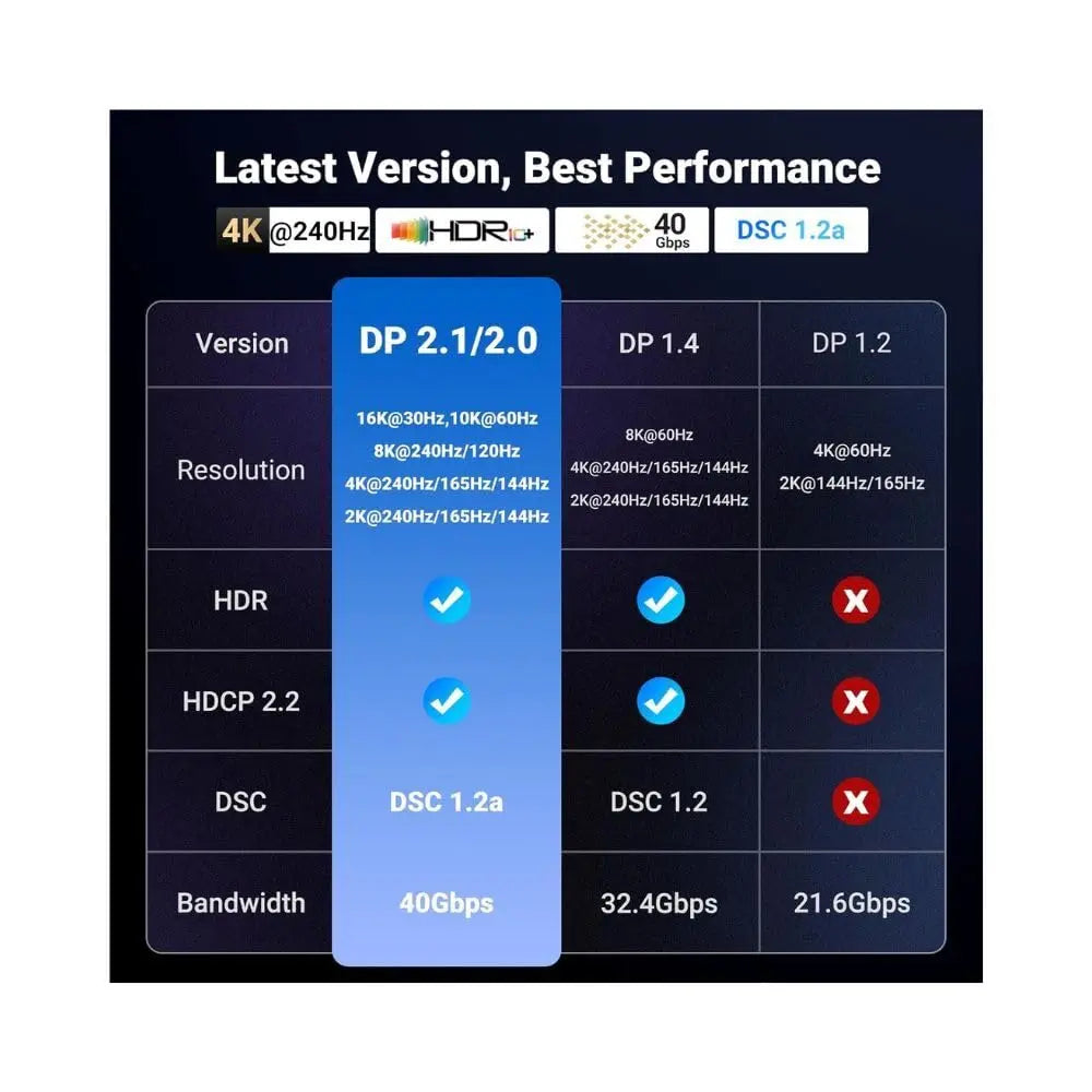 Cutting Edge 16K DisplayPort Cable: UGREEN16K DisplayPort cable 2.1 supports high resolutions 16K@30Hz, 8K@240Hz, 4K@240Hz. And backward compatible with Display Port 1.4 1.3, 1.2. Single-screen video output of 16K@30Hz (DSC 1.2a), and dual-screen supported. The DP to DP cable also supports HDR, HDCP 2.2, FEC forward error correction and UHBR10 which ensure your immersive viewing experience. (Note: 20-pin is disabled with no power. No need to worry about the 20-pin issues.)