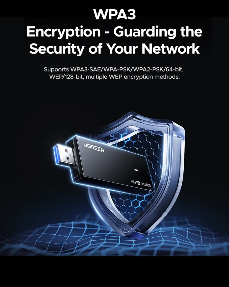 Yes — the adapter supports the latest WPA3 protocol for improved wireless security and encryption.