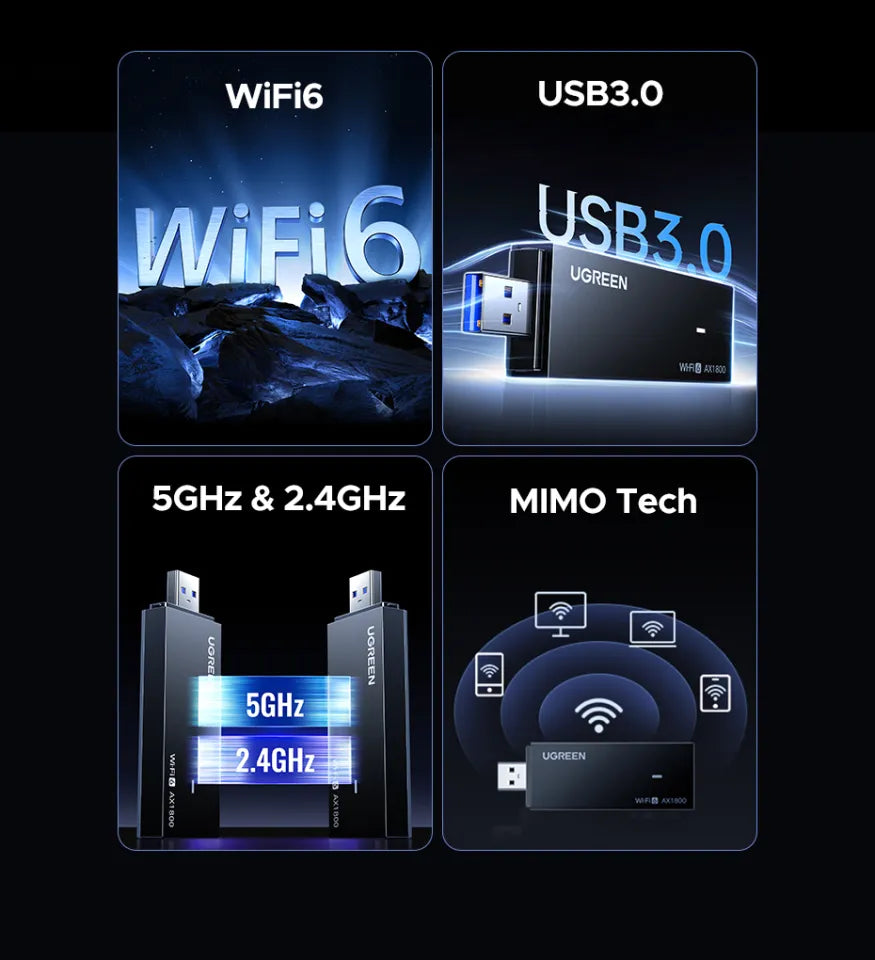 The UGREEN AX1800 USB Wi-Fi 6 Adapter brings modern wireless performance to devices that lack built-in Wi-Fi 6 support — without complicated setup. Just plug into a USB 3.0 port, and you’re ready to connect