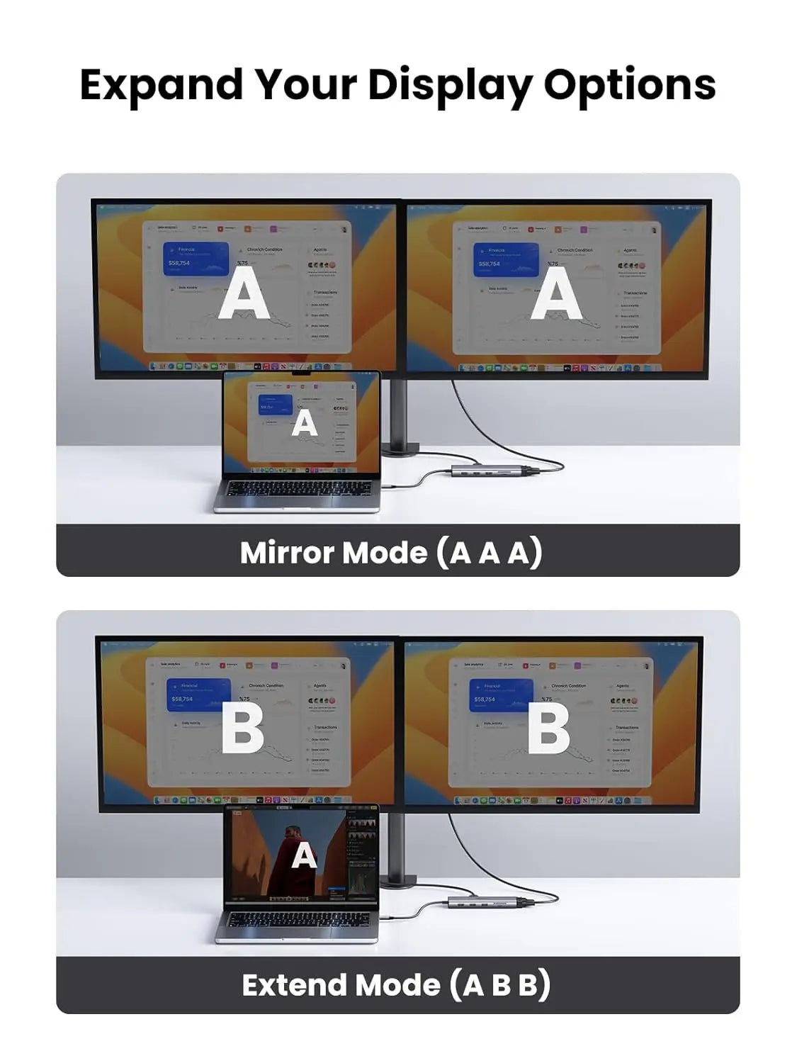 Dual Monitor Extended - The 4K HDMI and 1080P VGA ports can be used for different display devices (monitor, TV, projector) at the same time. The maximum output resolution reaches 4K@30Hz via HDMI and 1080P@60Hz via VGA. Mirror mode( AAA) and extended mode( ABB) are supported both on Mac and Windows.