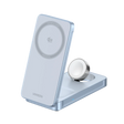 Purpose: All-in-one charger capable of wirelessly charging three devices at once — a compatible iPhone, AirPods (or other Qi2-compatible earbuds), and a smartwatch (e.g. Apple Watch).
