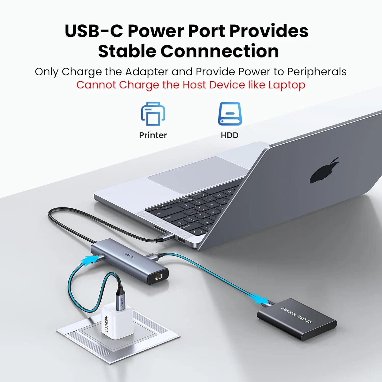 - USB-C Power Supply for Peripherals: The usb c to ethernet has an extra Type-C power supply port to power high-power devices like hard drives and get stable performance. (Note: Can't charge host devices like laptops, only for high-power peripherals.)